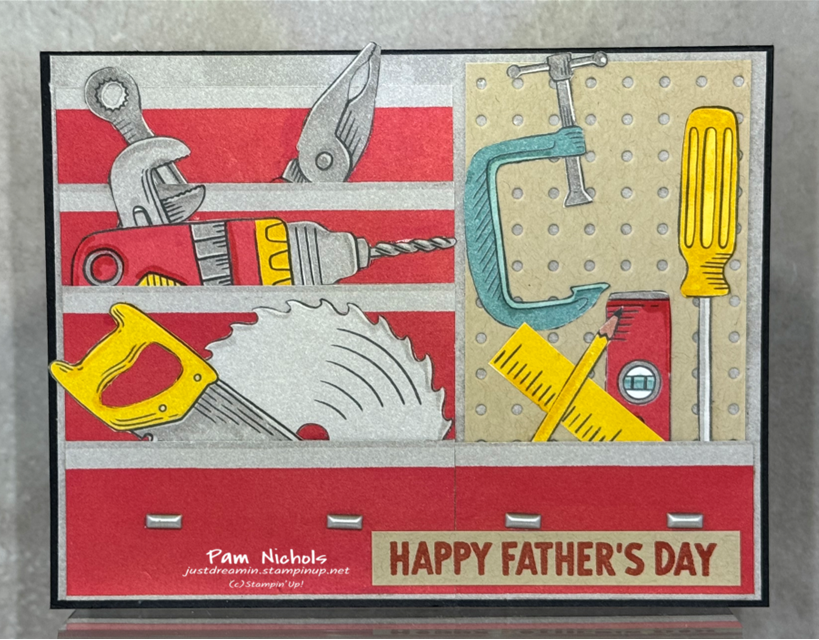 The tool chest was made using the retired Trusty Toolbox Designer Series Paper (DSP). However, this could have easily been made using Basic Black, Poppy Parade and Gray Granite cardstock cut into rectangles.